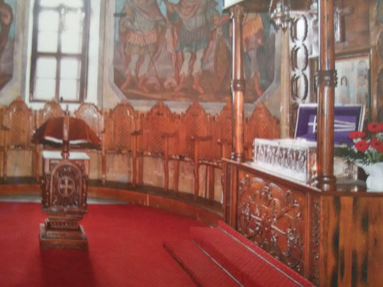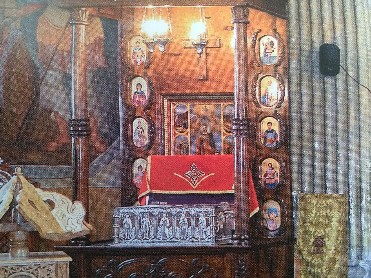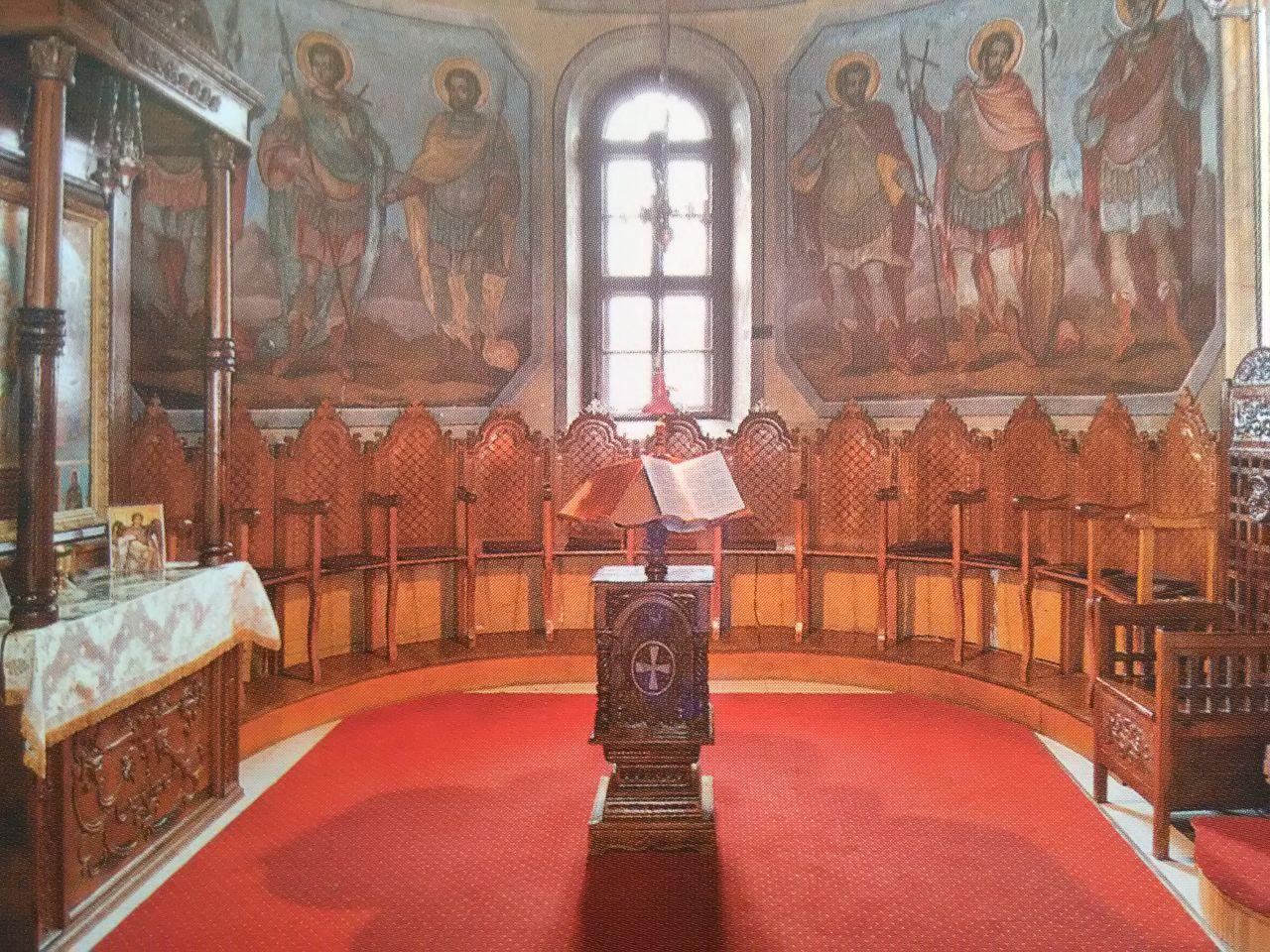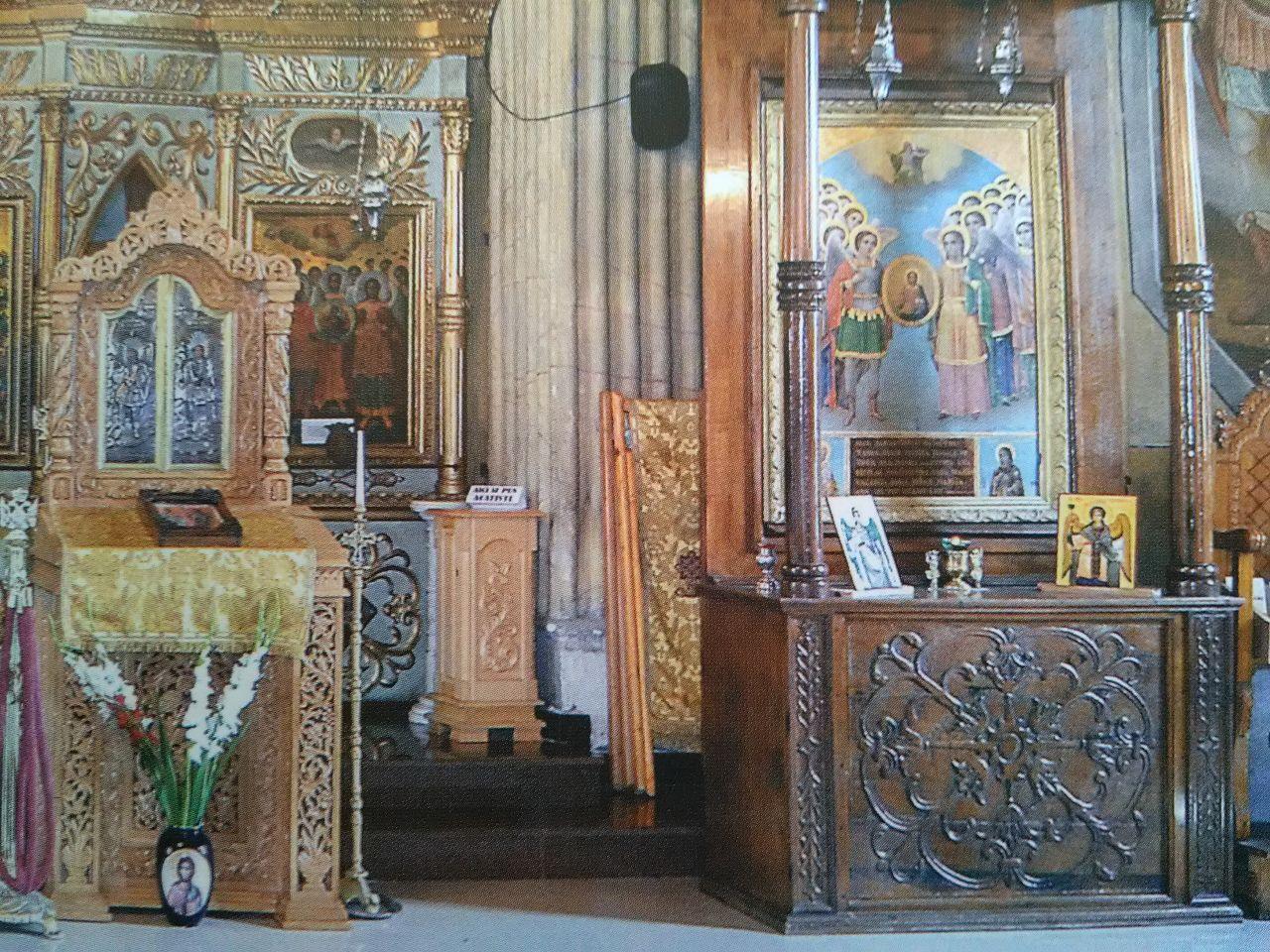 Iconostasul, păstrat până astăzi, datează din prima jumătate a sec. al XIX-lea, fiind realizat în vremea Arhimandritului Gavriil Smirneanul. Păstrează însă, de la vechea biserică, crucea iconostasului, datând din sec. al XVII-lea. Realizat din lemn şi stucatură, iconostasul cuprinde în colțurile de sus tablourile Sfinţilor Voievozi Mihail şi Gavril, iar în părţile laterale icoanele celor doisprezece prooroci, câte şase de fiecare parte, cu mențiuni în limba greacă. Tot în părţile laterale sunt şi icoanele celor doisprezece apostoli, de asemenea cu mențiuni în limba greacă. Cu ocazia reparațiilor din cursul sec. XX, au dispărut pietrele de mormânt existente încă înaintea primului război mondial şi datate din sec. al XVIII-lea, precum şi lespedea funerară a Arhimandritului Gavriil Smirneanul (1854, oct.30).