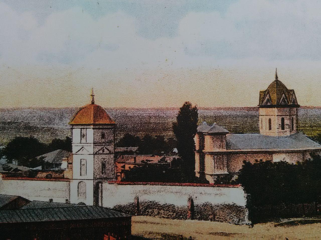 Pisania originală, din prima jumătate a sec. al XVII-lea s-a pierdut de multă vreme, dar biserica mănăstirii păstrează inscripții din secolele XIX-XXI. Inscripţia din anul 1842, cu texte în limbile greacă şi română, glăsuieşte: Biserica Sfinților Arhangheli Mihail şi Gavriil, pe care mai întâi a zidit-o Matei Voievod pe Slobozia postelnicului lenache Caragea în anul 1634. Dar căzând de cutremur, cum se vede acum, cu podoabă şi măreție, arhimandritul şi egumenul ei Davriil din Smirna a înălțat-o din temelie, domnind Gheorghe Dimitrie Bibescu, păstorind Neofit Mitropolitul, în anul 1842.